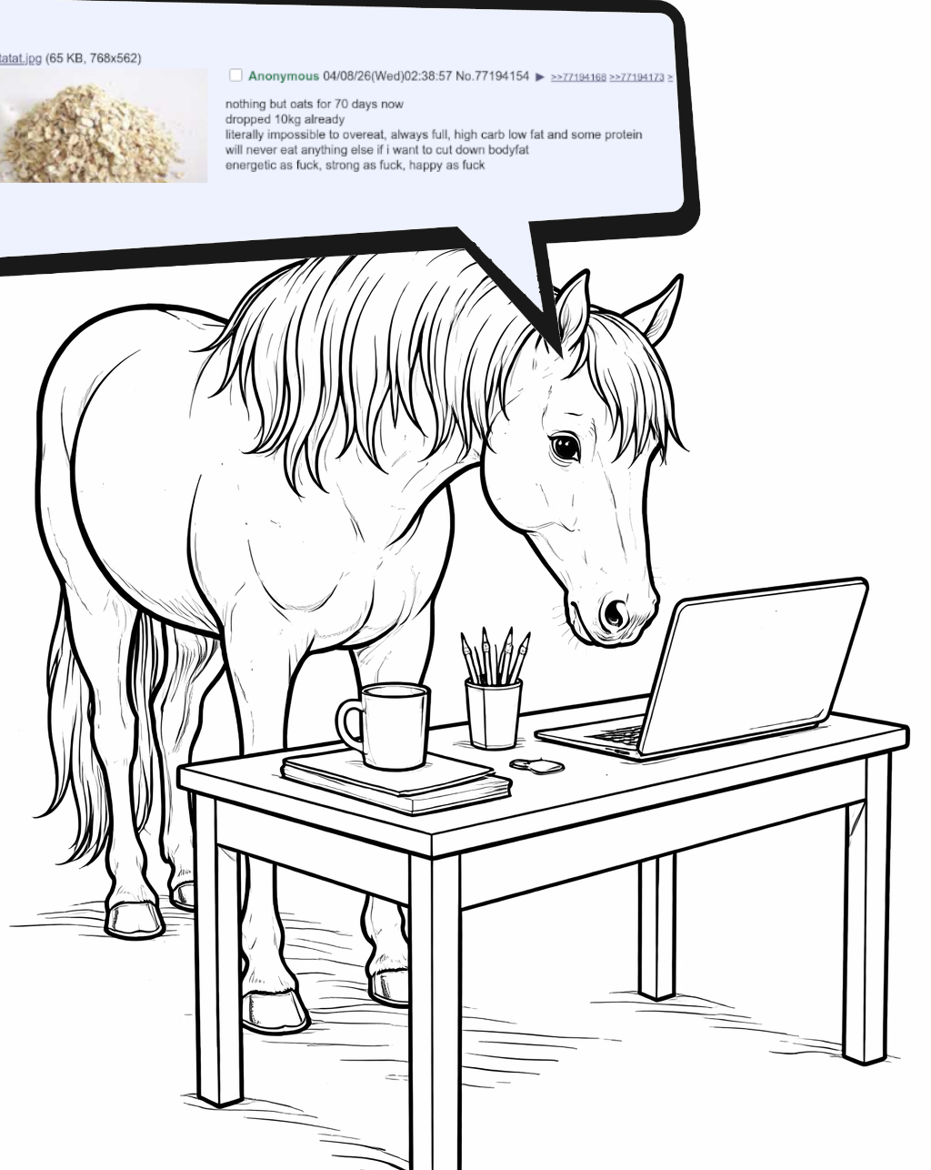 >>77194154>nothing but oats for 70 days>dropped 10kgits clearly not working. you could drop way more weight if youd just eat like a regular person and move your ass a little you FAT FUCK