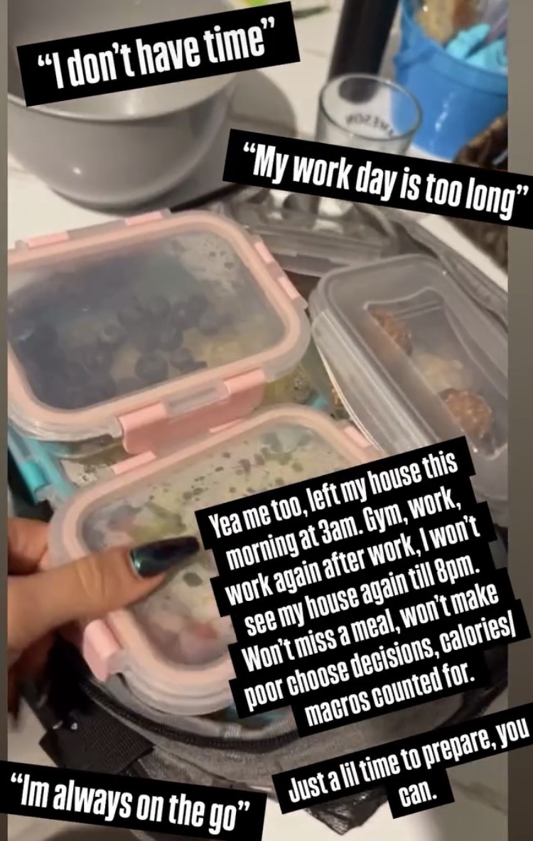 >>77195265>work after workher meal prep is missing basic macros because her brain is rotting and she doesn't realize how inefficient her day is.