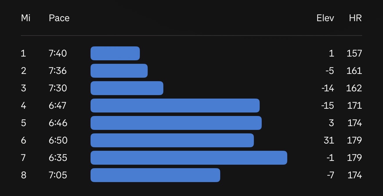 >>77197617Everything always seems to get weird during the taper. I know it’s not a lot of miles but why are you doing marathon pace about a week out? Take it easy.