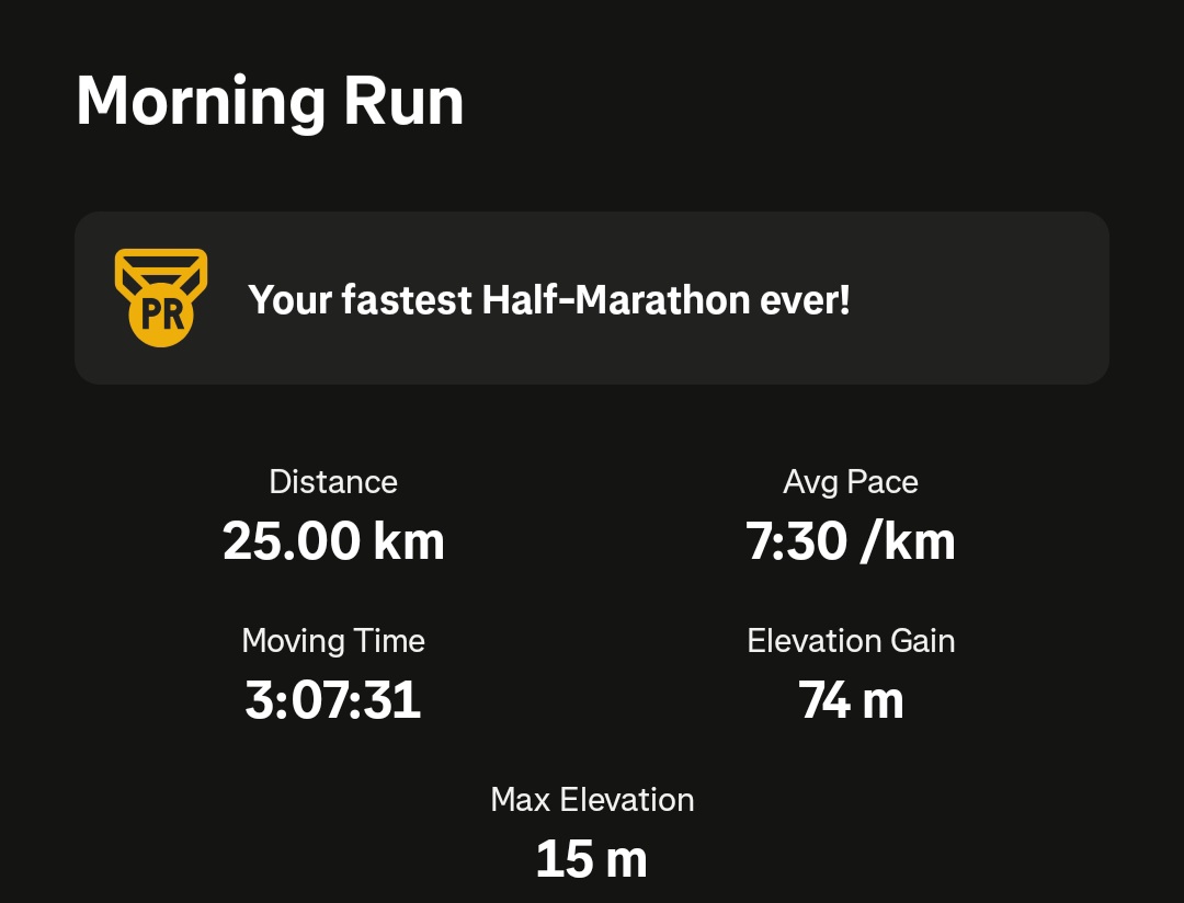 First time running a half marathon distance, 22km to be precise.Before that the longest run was 19km and regular 10 mile runs.Legs are a bit tired, cannot imagine running a full marathon desu. That shit must be really damaging.1:47h at 163bpm