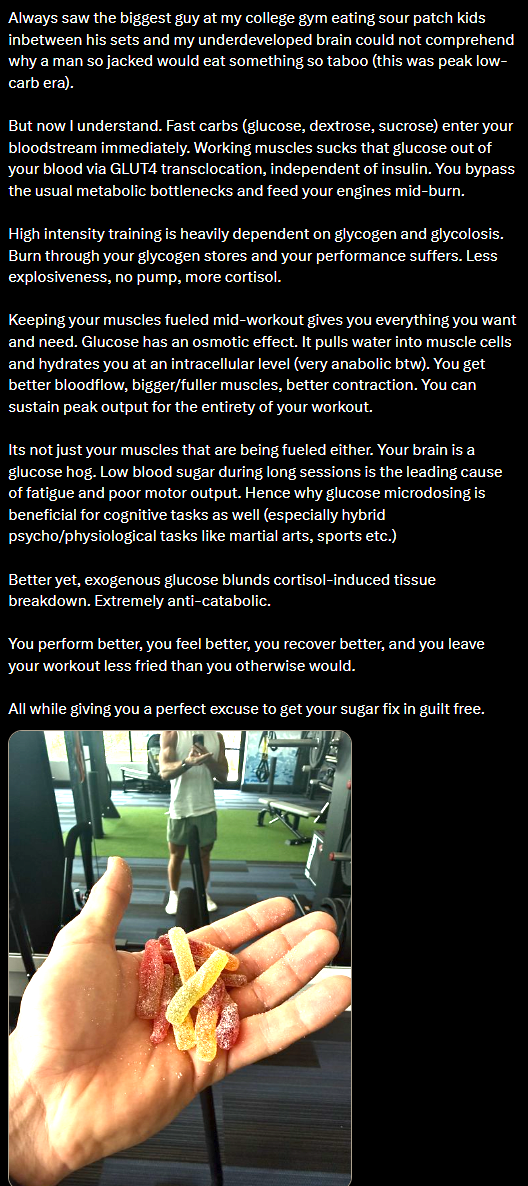 >>77201119>the biggest guy at my gymI wonder how many times I've read this exact line in retarded articles over the years before some moron tries selling you on some retarded "hack" or "secret". In this case some shit head is selling you on eating sour kids as though it's his reason he got some results. He is selling candy to babies.