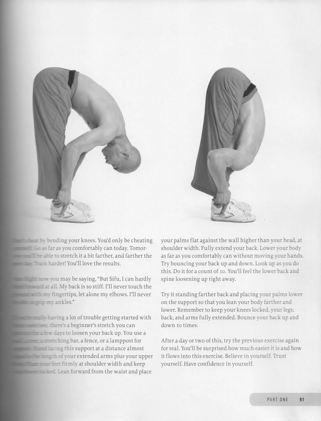 specifically for a fucked back, you can do this one and try to reach a bit further in front of you with your hands, as if you're trying to touch the floor a bit ahead of your body (but that is too far away to actually physically be able to touch it. glue your feet to the ground, and you should feel it quite hard in your hamstrings as they they to stabilize you, and you will feel the specific spots in your lower back that are fucked up. don't go too hard on them, but feel them out and slightly emphasize those spots with your "bounces".