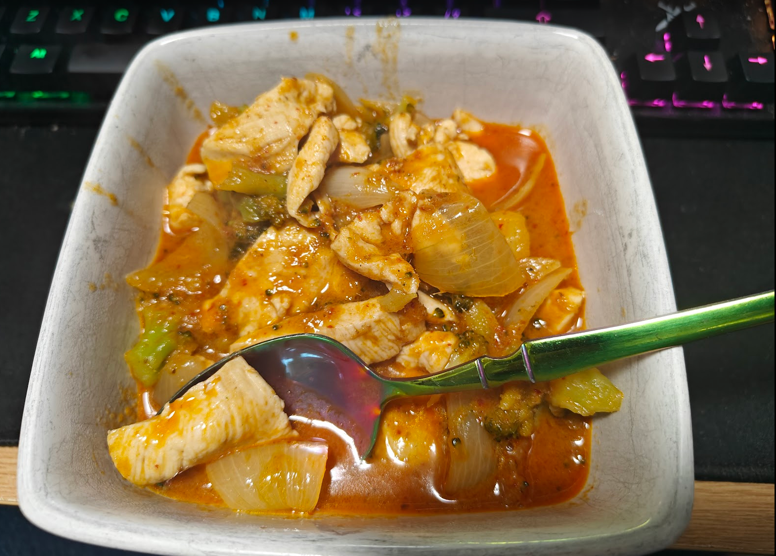 I made Chicken Penang for dinner, with broccoli and onion, 475 kcal, 51g protein