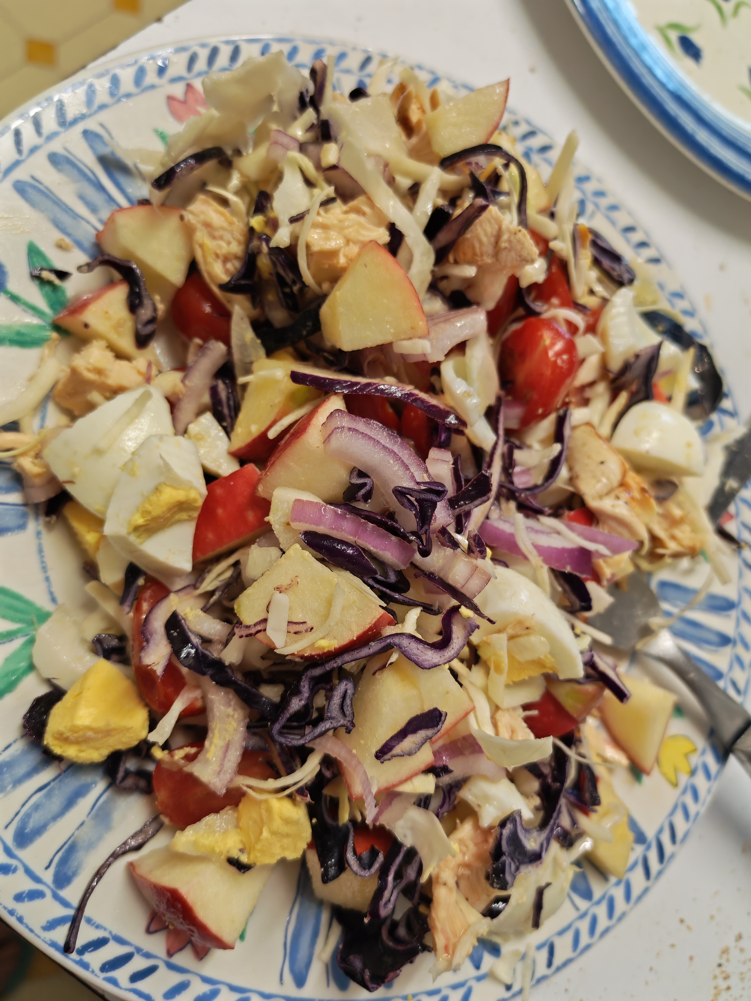 saladslop>cabbage and red cabbage>small red onion>chicken>two hard boiled egg>tomates>apple>oil