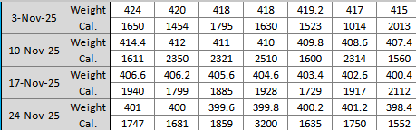 >>77211552Really big people lose a lot early on.Here's the data from my first 4 weeks. I started at 424 and was down to 398 by the end of the fourth week.