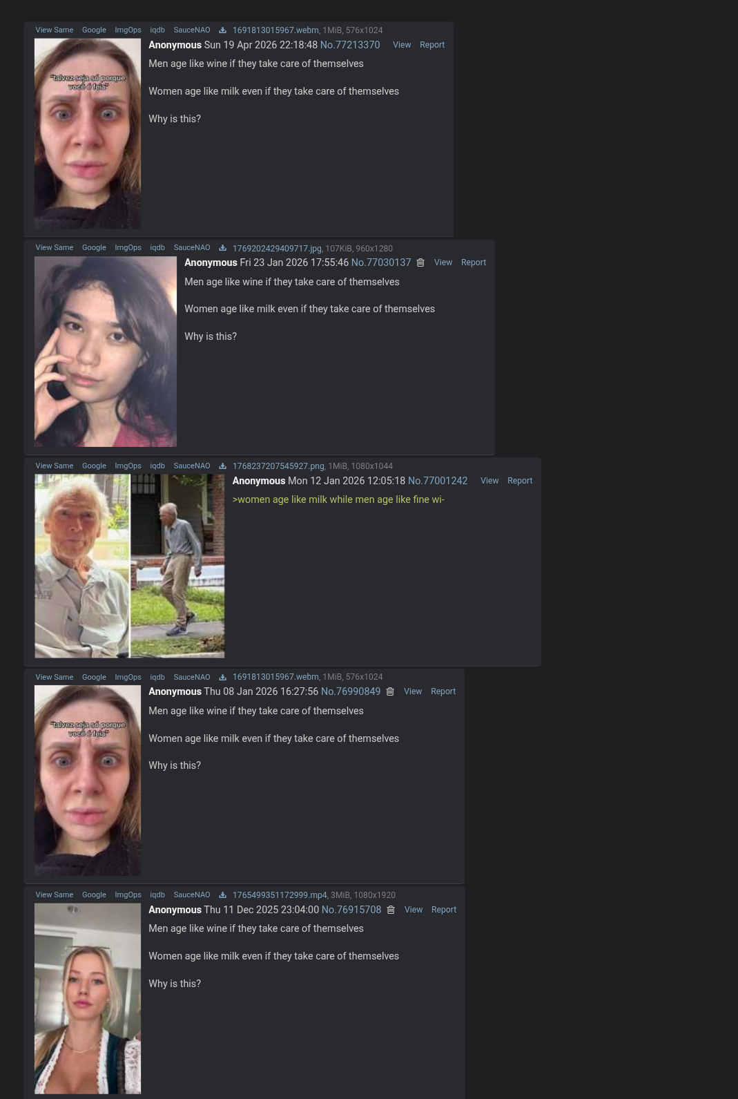 >>77214078Yeah that's the problem, it's observable that women still get courted well into their 50s and 60s regardless of their looks. Gilf, milf, hagmaxxing, cougars whatever you want to call it is super popular and socially acceptable. To have the same sexual status as a man past your late 20s you need to be 90th percentile looks (pro tip just because you have a patchy taper fade doesn't put you in this league, think claudio marchisio)Even the ghoul in OP still has more direct simps and suitors than the collective total number of "mires" all the 100 active users of this board have gotten over the past 5 years
