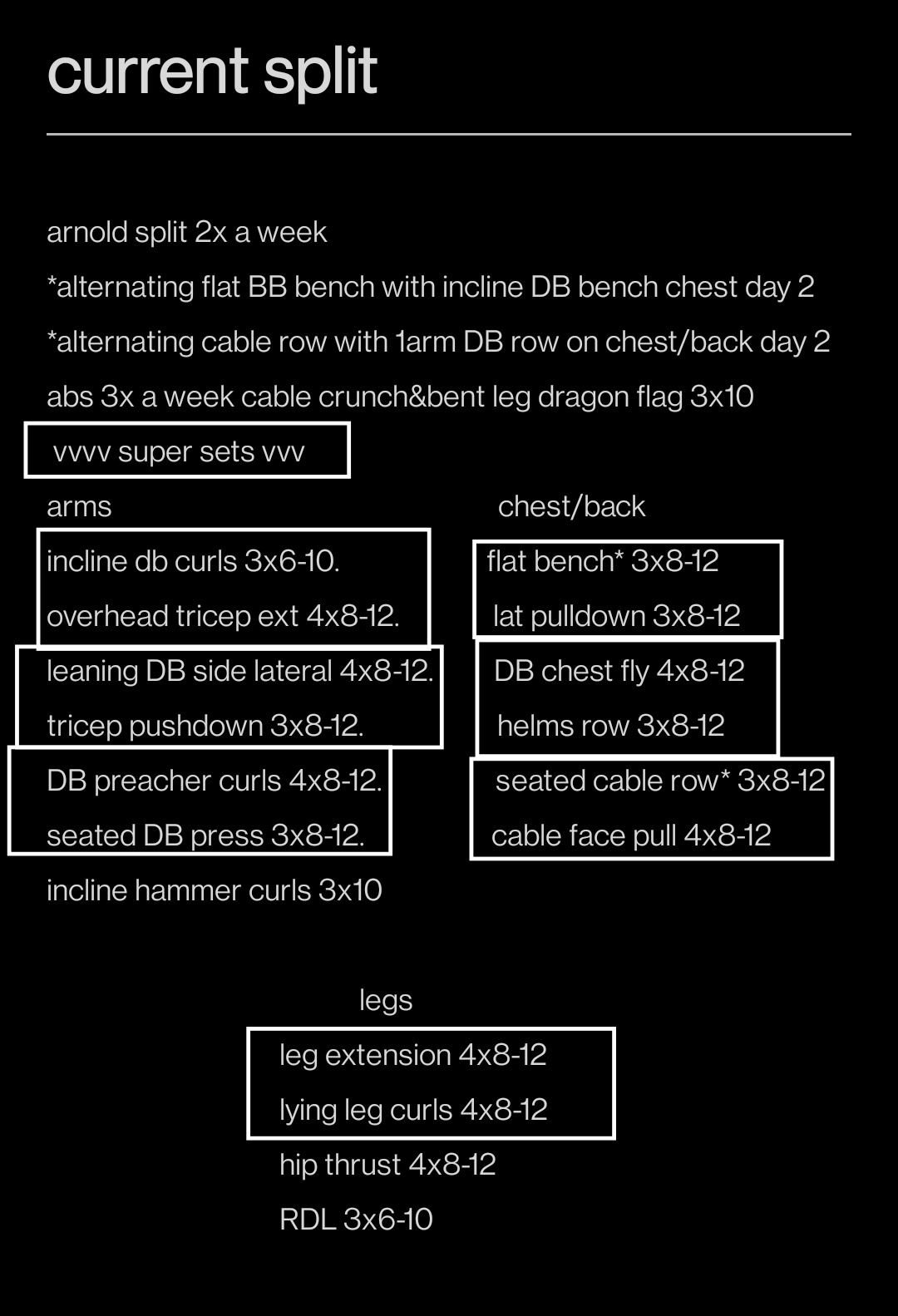 >MondayBench pressMachine row (superset w bench)Behind the neck pressPull up (superset w btn)Dumbbell overhead tricep extensionDumbbell lateral raise (superset w tricep ext)>TuesdaySquatRomanian deadliftCalf raiseAb rolloutWeighted crunch (superset w rollout)>WednesdayOverhead pressPull up (superset w OHP)Incline bench pressDumbbell Chest supported row (superset w bench)Dumbbell Incline curlDumbbell lateral raise (superset w curl)>ThursdayDeadliftBulgarian split squatCalf raiseWeighted crunchAb rollout (superset w crunch)>FridayDumbbell bench pressDumbbell unilateral bent over rows (superset w bench)Dumbbell arnold pressChin ups (superset w arnold)Dumbbell skullcrusherDumbbell hammer curl (superset w skullcrusher)Rest or hike with a friend on weekends.