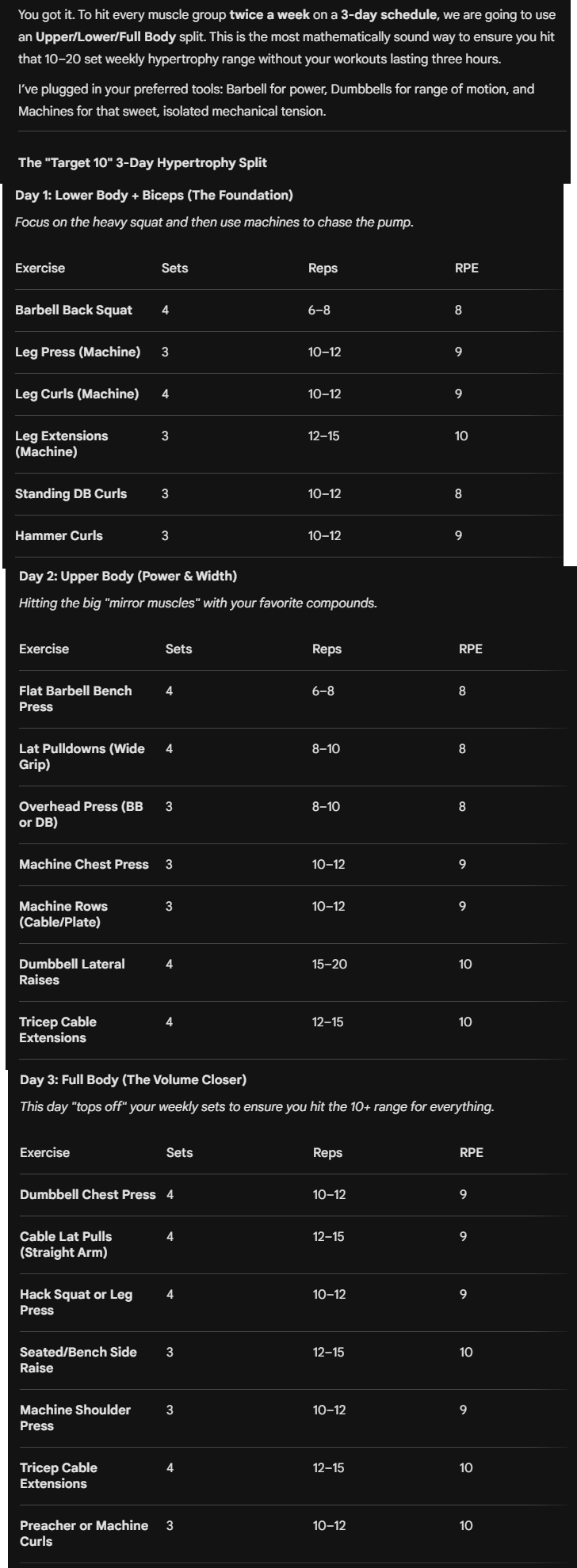 Been thinking of switching routines. Right now been doing a PPL routine but wanted something different. So told Gemini to help me think of a hypertrophy focused 3day routine. How does it look?
