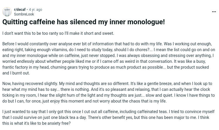 >>77227241what about someone who suffers from anxiety & overthinking who has been off caffeine for 9 years now?
