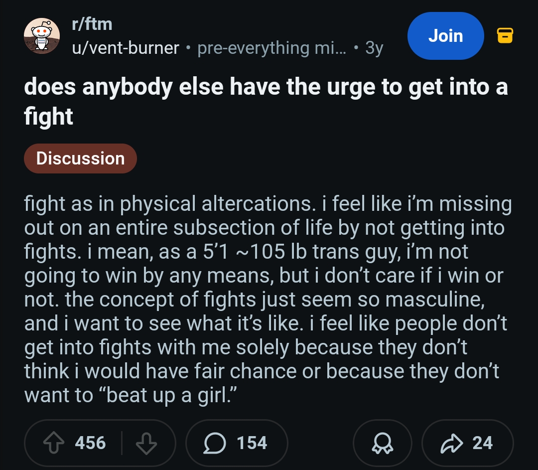 >>77231033why do ftms always feel so fakelike here they're going "grrr i'm so angry i want to be a man and get in a fight' why are you larping