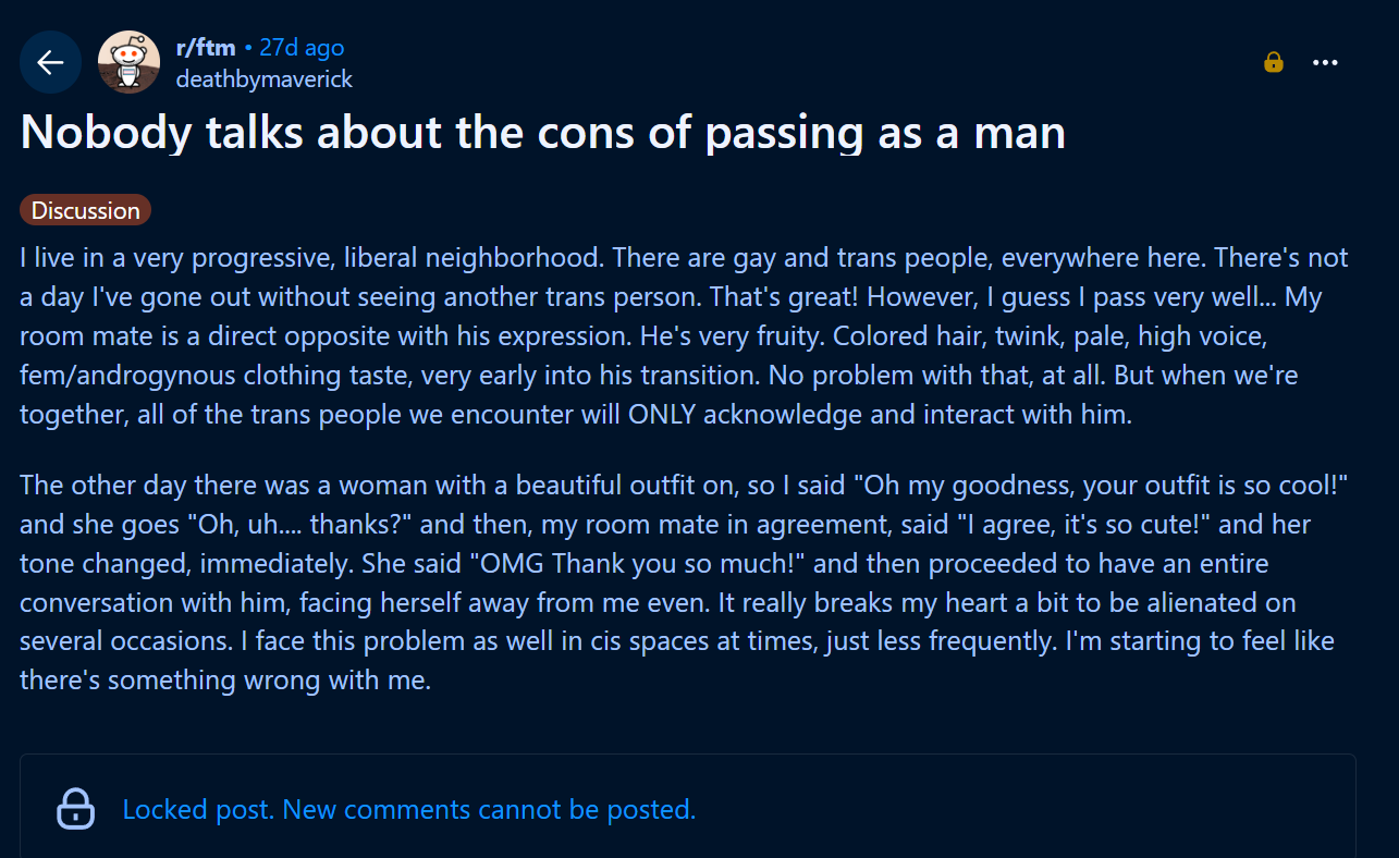>>77231859Perfect example of why transgenderism almost never works. No (straight) man is saying "Oh my goodness, your outfit is so cute!". Takes much more than just taking T and wearing some different clothes. Completely different mindset between genders.