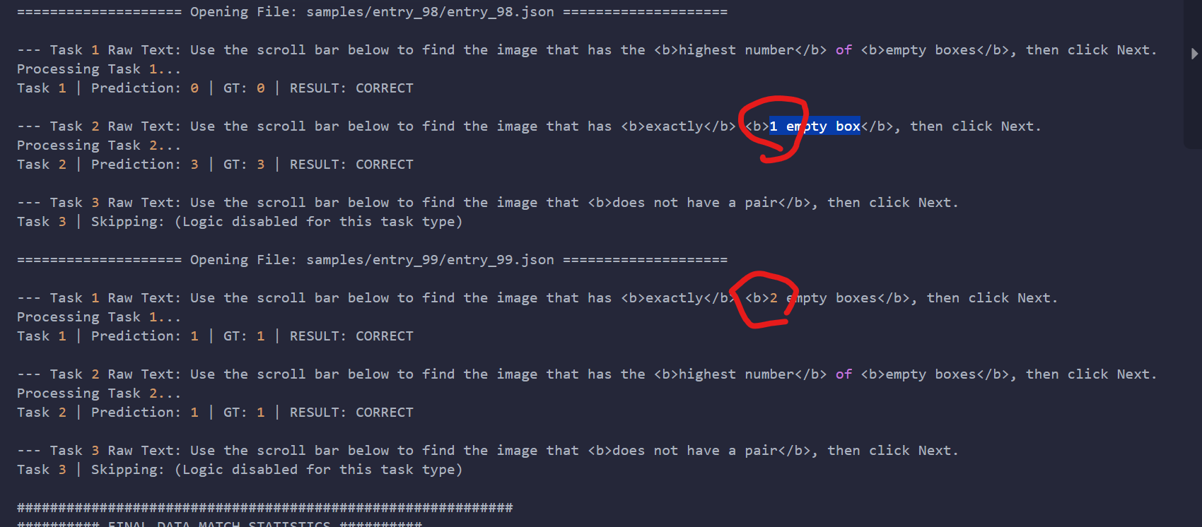 Hello /g/ I made a captcha solver based on opencv ==================== Opening File: samples/entry_99/entry_99.json ====================--- Task 1 Raw Text: Use the scroll bar below to find the image that has <b>exactly</b> <b>2 empty boxes</b>, then click Next.Processing Task 1...Task 1 | Prediction: 1 | GT: 1 | RESULT: CORRECT--- Task 2 Raw Text: Use the scroll bar below to find the image that has the <b>highest number</b> of <b>empty boxes</b>, then click Next.Processing Task 2...Task 2 | Prediction: 1 | GT: 1 | RESULT: CORRECTComment too long. Click here to view the full text.