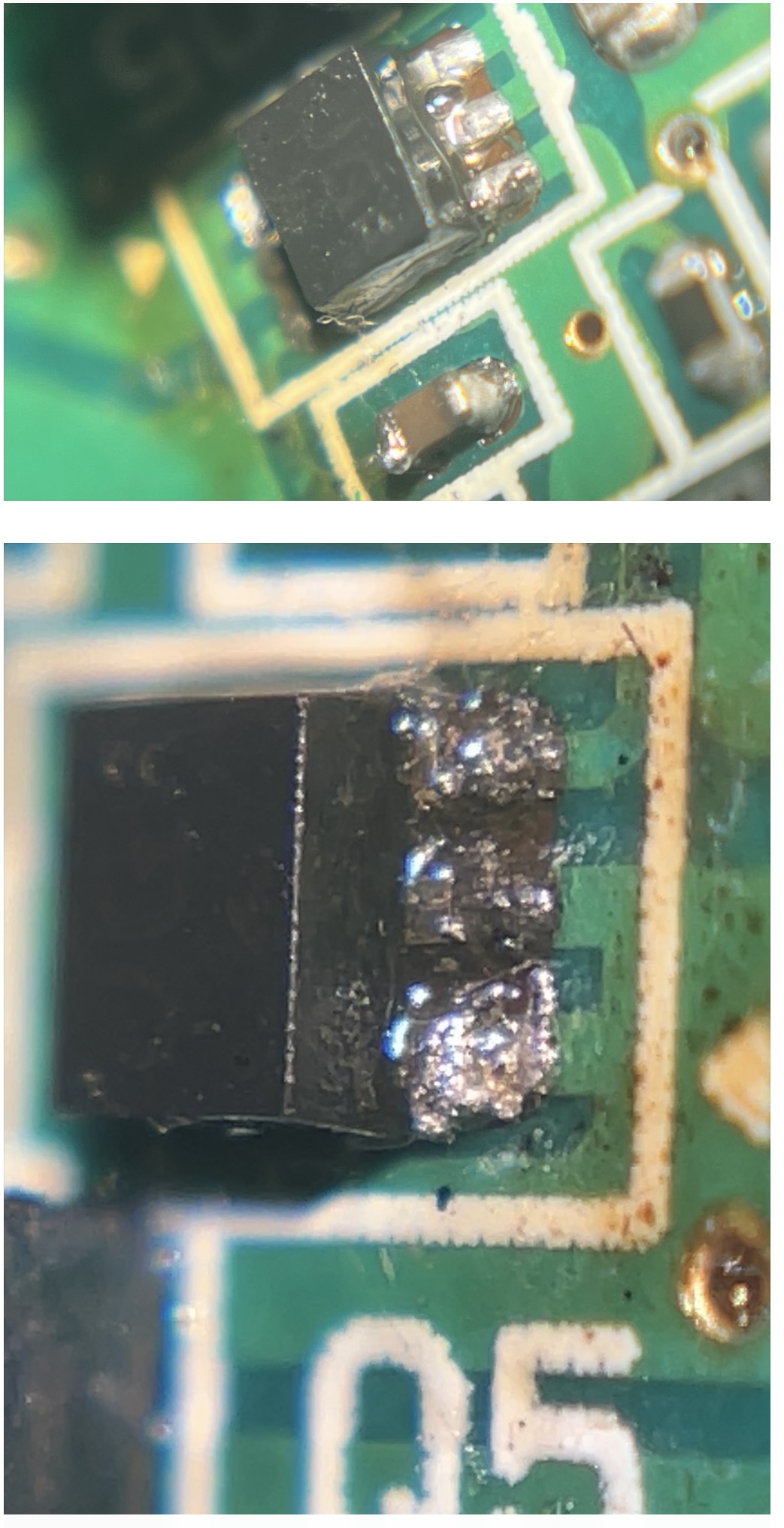 i should have looked closer. you may have to remove some of the solder mask from those traces in front of the legs so you can actually get something down. it also looks like you don't have enough heat in the solder you are using. you may also try a tiny bit of wire from the (lightly) scraped back traces to the legs that are broken off.