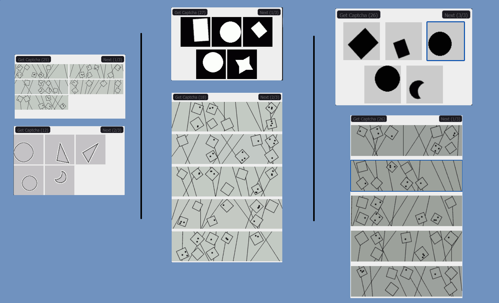 >>107661262Not much, the way the images are displayedLeft is the first script postedCenter is >>107661229Right is one I just made changing <the <div>s to <button> so tab navigation works: https://pastebin.com/raw/PXZ091fHThe main difference between 1 and 2+3 is how the wide captchas are shown, I prefer having them all lined up than being too small to see