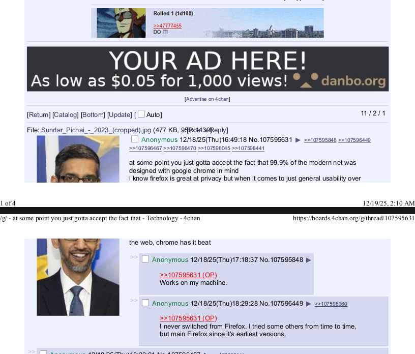 >>107595631>just gotta accept the fact that 99.9%Is that a fact, tho?And even if it is, can you actually make me accept it?More importantly, you should be questioning how this came to be.>the modern net was designed with google chrome in mindHTTP is only a tiny chunk of 'the net'... As chrome can't actually do... most of that, what makes you think it was designed for chrome?Just because all the internet is to *you* is a few shitty websites, doesn't mean that's all it is...>>107596467>The internet no longer really exists.Oh. It does.There's just shit all in the way. The desperate grab for monetisation in the 90's normalised the enshittification process what has just accelerated and intensified. All these artificially imposed layers don't actually *need* to be there...Comment too long. Click here to view the full text.