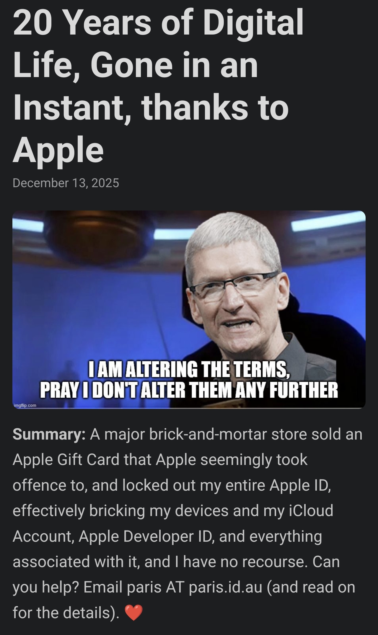 >Apple has blocked a long-time developer from his Apple ID after he failed to redeem what support suggested was a dodgy $500 gift card, leaving him unable to work, cut off from personal files, and barred from what he calls his "core digital identity."