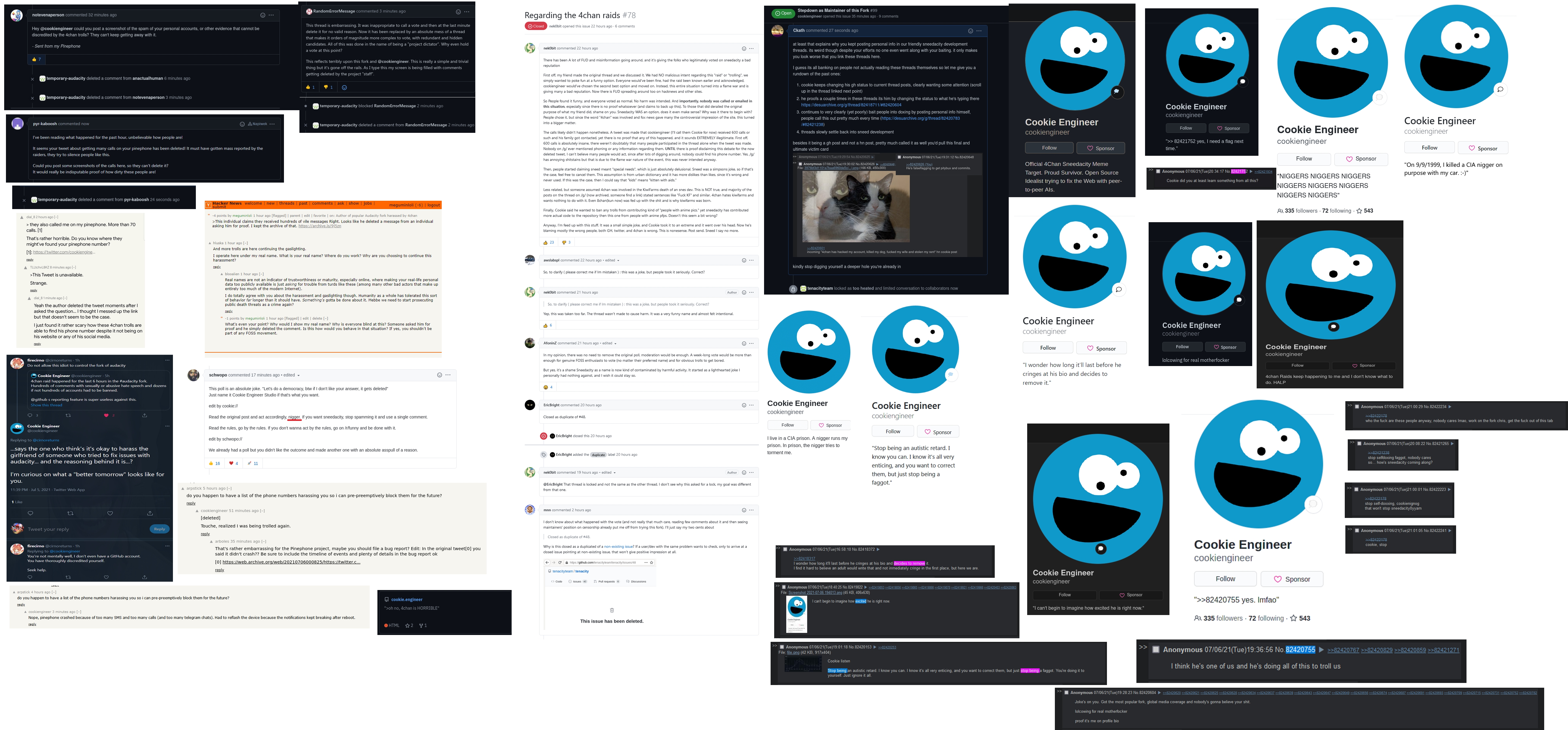 >/g/ starts clowning on him for betraying the internet and makes their own sneedacity-themed fork. this pisses off cookiefaggot and he starts a false flag campaign to feign harassment with the goal of getting the project shut down