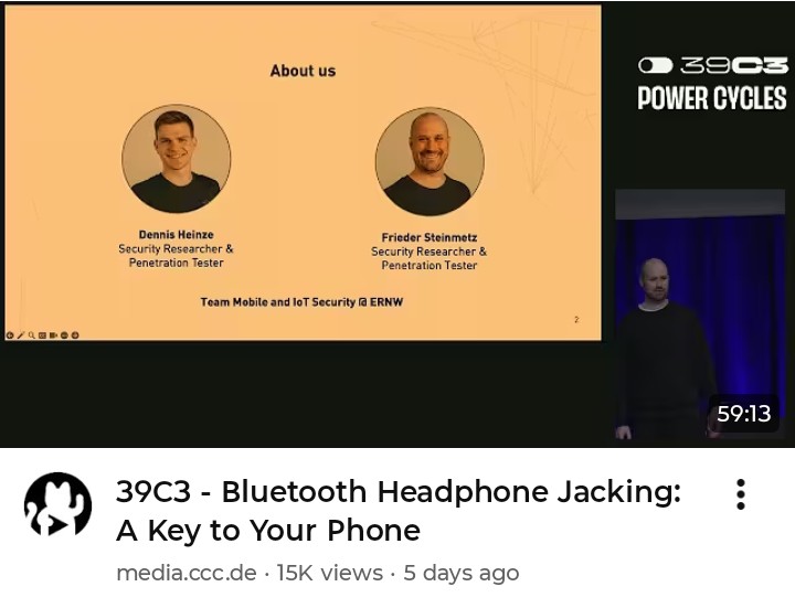 https://youtu.be/TK5Tz4Bt94Y?si=lhjNOsOvc1EweNiJI'm glad they made the video, but I think it has been common knowledge for quite some time that the protocol is highly insecure and that anyone spoofing a pair of headphones can inject executable instructions. China's 110 group has been using this heavily for about nine years on American soil because the short range of the signal necessarily means there is no automated logging of the code used to achieve the penetration as there would be when using a cellular traffic protocol. Once someone gets into a phone in this way, they can even re-program the phone to act as a Bluetooth spoofer which automatically maps out networks of acquaintances.One of the most common implementations when 110 uses it is to send a young woman with the Bluetooth spoofer into a gym in, let's say, Arlington, Virginia (as many federal employees and people who work for defense contractors live there) so that they can get close to people who have Bluetooth actively running to stream music. The girls will usually be wearing American-themed patriotic attire, which is laying it on a bit thick if you ask me.The U.S. Government has been silent on this issue the entire time but has made some plans to build ELINT-secure gyms in government buildings and to encourage employees to use those employee-only gyms to "prevent workplace injuries." The trouble is that the federal employees are not being warned against using Bluetooth and they are not being warned against using public gyms.
