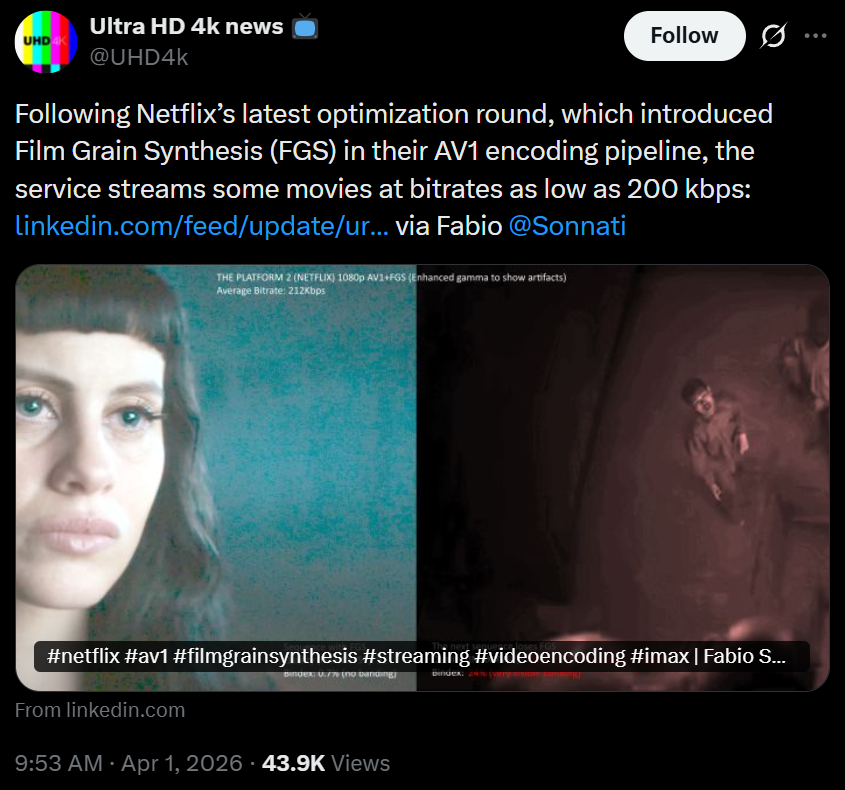 BONUS: Netflix adds a fake film grain filter not present in the video to hide how shitty and starved the original streams fucking look Congrats AV1 clowns you played yourselvesThe future you all wanted lololololololololol