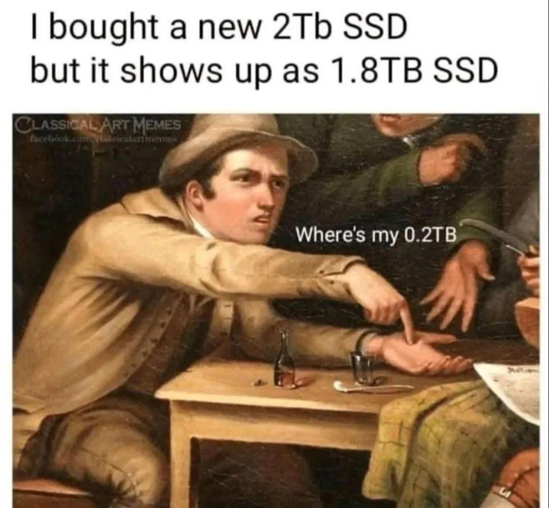 >>107667311>It's the fault of the euros that computers don't work in base 10It's the fault of Microsoft for showing you TiB values with a TB suffix.It's your fault for being so fucking computer illiterate to not know this.Fuck I hate this board.