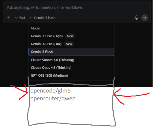 Does anyone know how to get OpenCode or OpenRouter to work natively inside antigravity's agent panel. I don't want to use opencode in the terminal because it doesn't work with hunks etc.