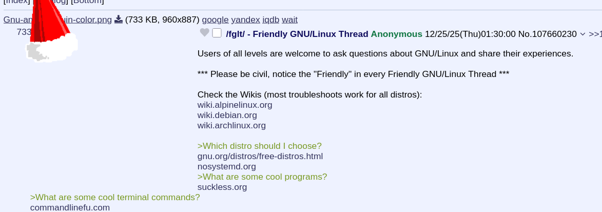 Users of all levels are welcome to ask questions about GNU/Linux and share their experiences.*** Please be civil, notice the "Friendly" in every Friendly GNU/Linux Thread ***Check the Wikis (most troubleshoots work for all distros):wiki.alpinelinux.orgwiki.debian.orgwiki.archlinux.org>Which distro should I choose?gnu.org/distros/free-distros.htmlnosystemd.org>What are some cool programs?suckless.org>What are some cool terminal commands?Comment too long. Click here to view the full text.