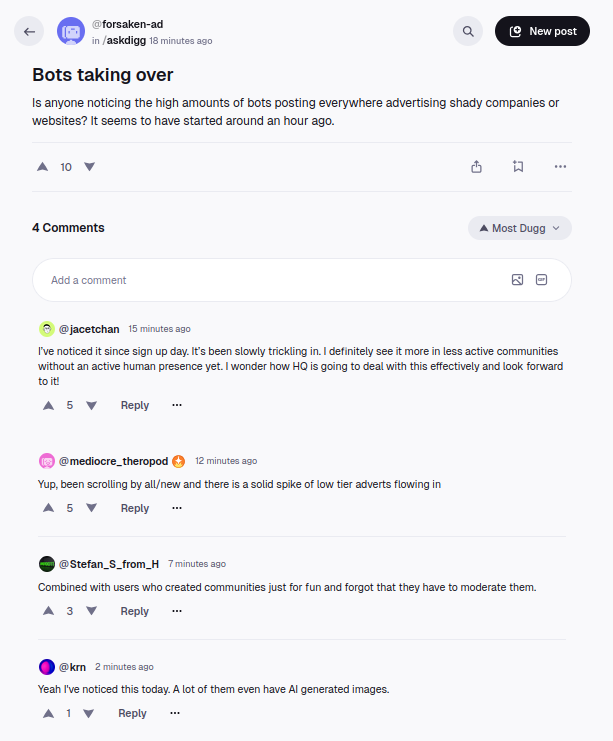 >The reboot of the early internet online community Digg, a one-time rival to Reddit, is moving forward. The company, which is today back under the ownership of its original founder, Kevin Rose, along with Reddit co-founder Alexis Ohanian, is launching its open beta to the public on Wednesday.https://techcrunch.com/2026/01/14/digg-launches-its-new-reddit-rival-to-the-public/Oh no! Free speech! How dare they!