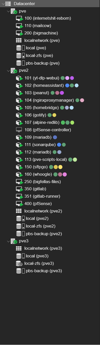 I added a third node to get quorum. My setup is now 2x14700K/128GB with one 3060 for Plex transcoding and the other server is running some LXC containers. Third is a PN53 with a ryzen 7, 32GB and 2TB SSD. I have way too much gear for my skill level but if I'm honest with your bros with chatGPT I've built quite a homeserver cluster for myself. If only I had more time for this. Currently on the main performance node I'm replacing my old server slowly by a more better organized and isolated bunch of services. The old spaghetti code works, but it's not maintainable. New one is done entirely OOP and everything is properly running in containers. I haven't written a single line of code, I've been letting Codex do it. I realised that I don't even like to code, I like to dictate more. I like to plan and figure out how things should work but I am not interested one bit in how they are working, unless that becomes a problem, like it did with my old server. Codex has changed my life. With good guidance, and it really needs some good knowledge of where GPT5 has its limits, it's another world of advanced. I think I'm spending about 10 times less time on development because I can make it write tests for me and I can just observe the tests make sense. All the tedious shit is no longer a problem. At work if only they knew how much is vibe coded... Well, it's better if they don't.