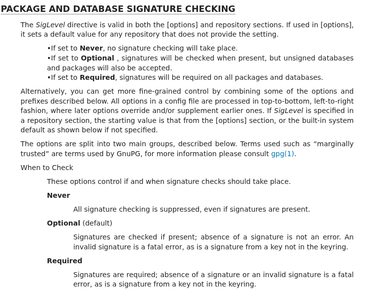 >can't update packages, new packages are signed with a PGP key that's not in the keyring>can't update the keyring, it's signed with a PGP key that's not in the keyring>check the documentation>pacman doesn't even enforce signatures by default>it only enforces valid signatures on packages that are actually signed>pacman gets literally zero security from checking package signatures, because an evil mirror could just serve users unsigned trojan packages insteadWTF how is this real, this distro is literally a fucking joke