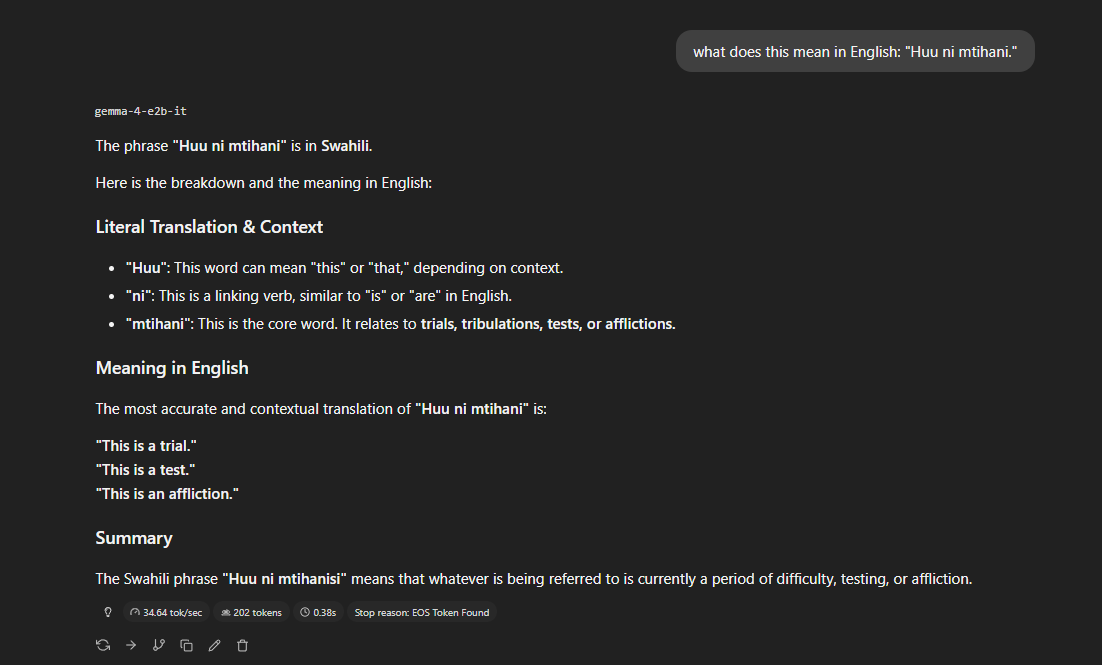 Very impressed with Gemma 4 here so far. Neither Qwen3.5-2B or Qwen3.5-4B are able to get this right ever even with reasoning, Gemma4-E2B-IT got it right first try *without* reasoning (the closest answer is "This is a test" which is one of the options it gave there).