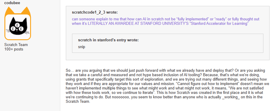 I may be late to the party on this but my alphoomer nephew just showed me a locked thread of the Scratch Director of Technology losing his cool at 10 year olds and and being moderated by his own moderation team due to his "impolite" remarks while arguing over TOS changes that trains AI on user projects and adds an AI assistant. I guess not all gen alphababies got oneshotted by LLMs. Where's his PR guy to tell him a grown man throwing redditisms like "ad hominem" and "false narrative" at users he acknowledges in the same thread are statistically 80% under the age of 12 comes across incredibly retarded and tactless?
