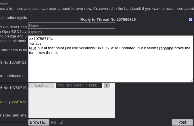 >>107567194>snapsNTA but at that point just use Windows 10/11 S. Also unrelated, but it seems rapeape broke the tomorrow theme.