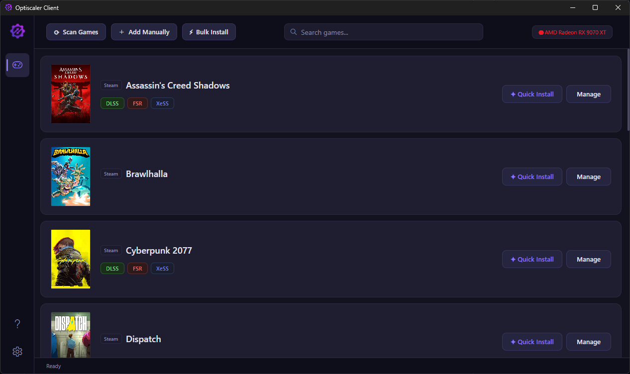 >>108502039>where's the 6000 and 7000 series supportIt auto detects if you have rdna 3 or rdna 2 and then uses FSR 4 INT 8 if so>NVIDIA cards it's a simple global toggleBulk install is also a feature of the client>third party hacksI would trust a FOSS program that like this that gives the user control more than Nvidias closed source AI coded garbage, they are the same company that last month released a game ready driver for their big sponsored game RE9 that bricked peoples gpu fans and caused performance issues