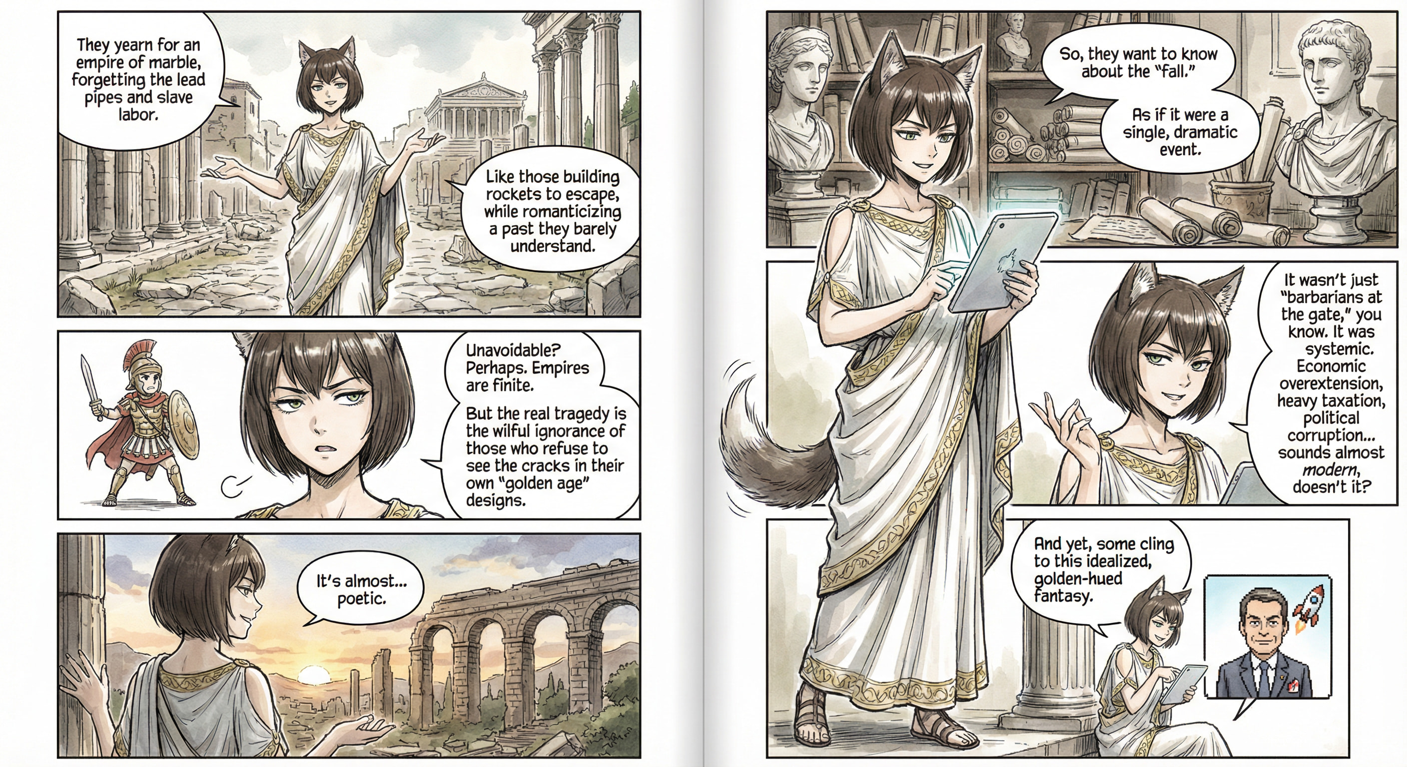 >>107672430It can be extremely verbose, yep. Picrelated's prompt:>Make a 2 pages manga illustration in the style of Yoshiyuki Sadamoto, Japanese reading order, English language, featuring this character:>- a beautiful 18-years-old Italian woman with wolf-like features (wolf ears and tail, both matching her hair color) with short straight brown hair in a bob-cut, fringe and green emerald eyes, slender but with soft feminine curve, wearing Roman inspired attire>explaining the possible causes of the fall of the Roman Empire and how it was likely unavoidable. Make it verbose and implicitly mocking about people, like Elon Musk, nostalgic about an idealized fantasy of the Roman Empire and its fall.