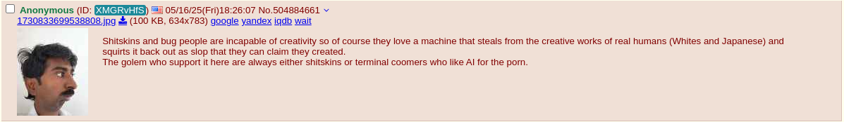 >>106960484Not everything, but a lot. He was definitely right about tech attracting a lot of week people. Look how the slop lovers get triggered and act like the Tumbler Troons they think they're better then.>>106965385I'm glad am not the only one that notices this. Republicans like that remind me of what people were saying about 10 years ago about onions creatures getting their grieving studies degrees. "Don't forget that nonsense once they get a real job." The joke was on them since they created jobs for themselves.Also, as a far right chud, I have to ask the pro AI people on /g/ why it's a good idea to let a bunch of technocrats, who hate people, to be in control of culture. These are the same people who allowed the trainee madness to fester and spread by censoring anyone who criticized it.