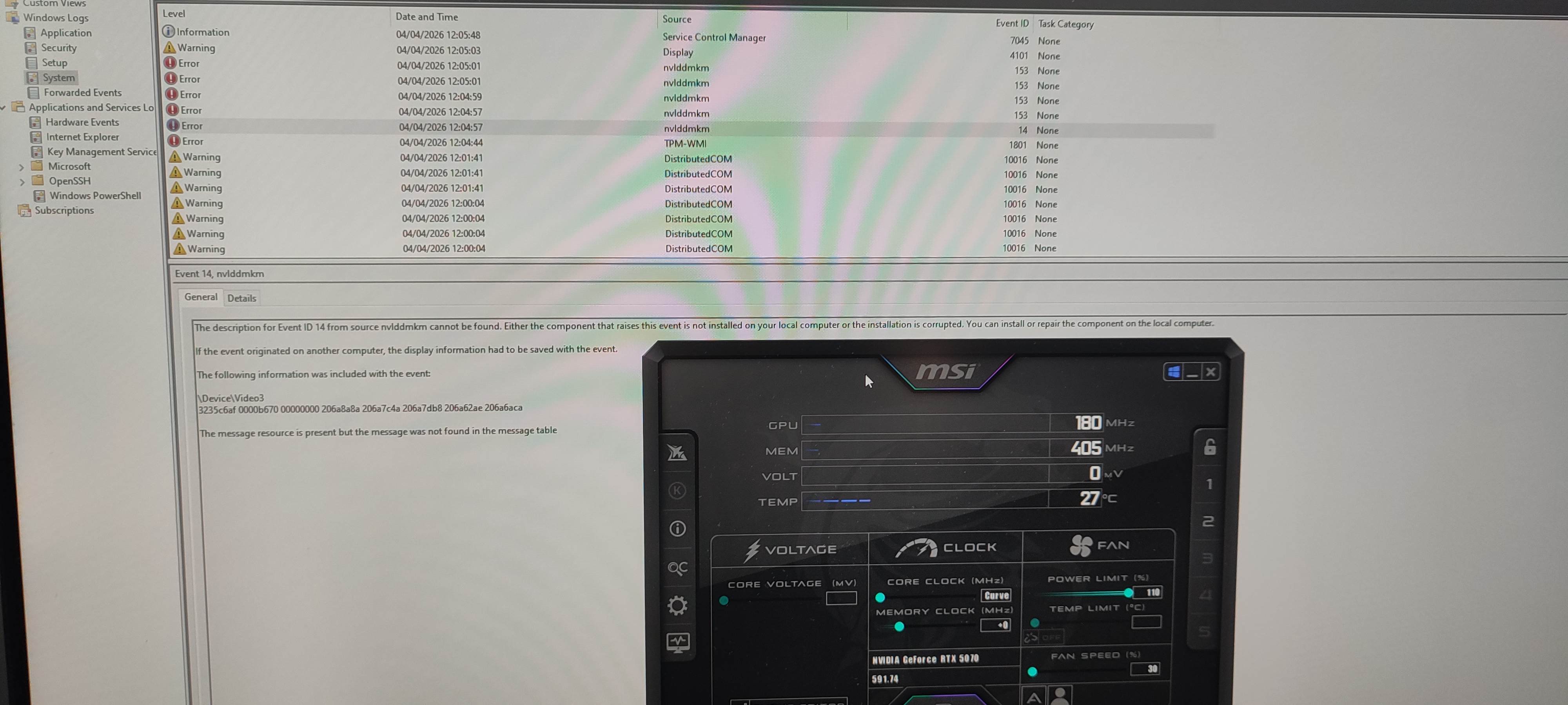 >wake up>turn on my system on a cold morning>random blackscreen before display comes back>have to reapply afterburner settings>event viewer gives me a 153 tdr resetOh boy, I hope this is not the 50 series driver shit or my voltage curve somehow being unstable at idle, or that my power connector isn't somehow coming loose