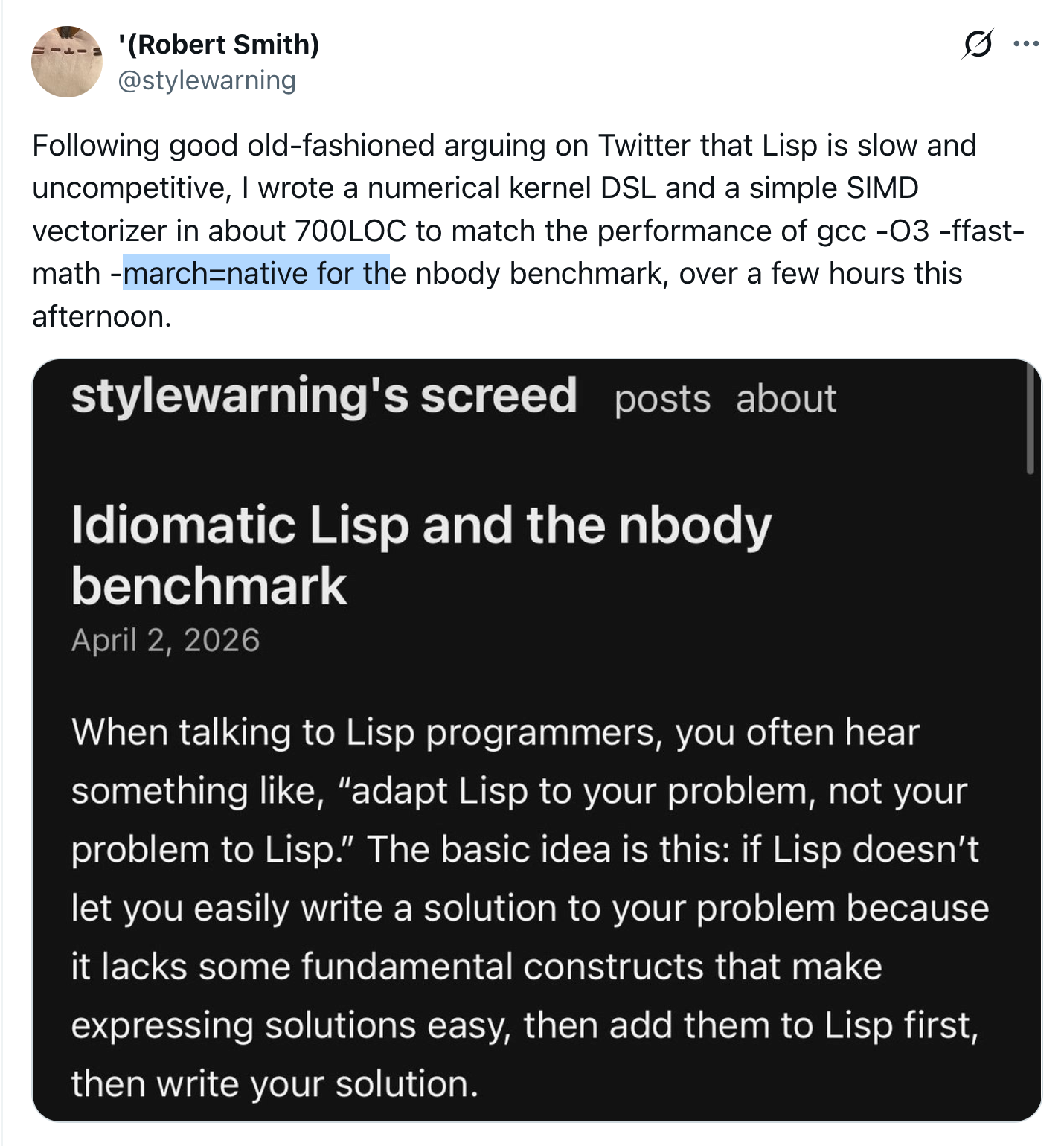 >So, in fact, we have matched the performance of C almost exactly. Furthermore, the generated code is still not as lean as it could be. Not to put too fine a point on it, but, <100 lines of LispbasedFINALLY some respite in the benchmark autism wars for CL bros.>https://www.stylewarning.com/posts/nbody/