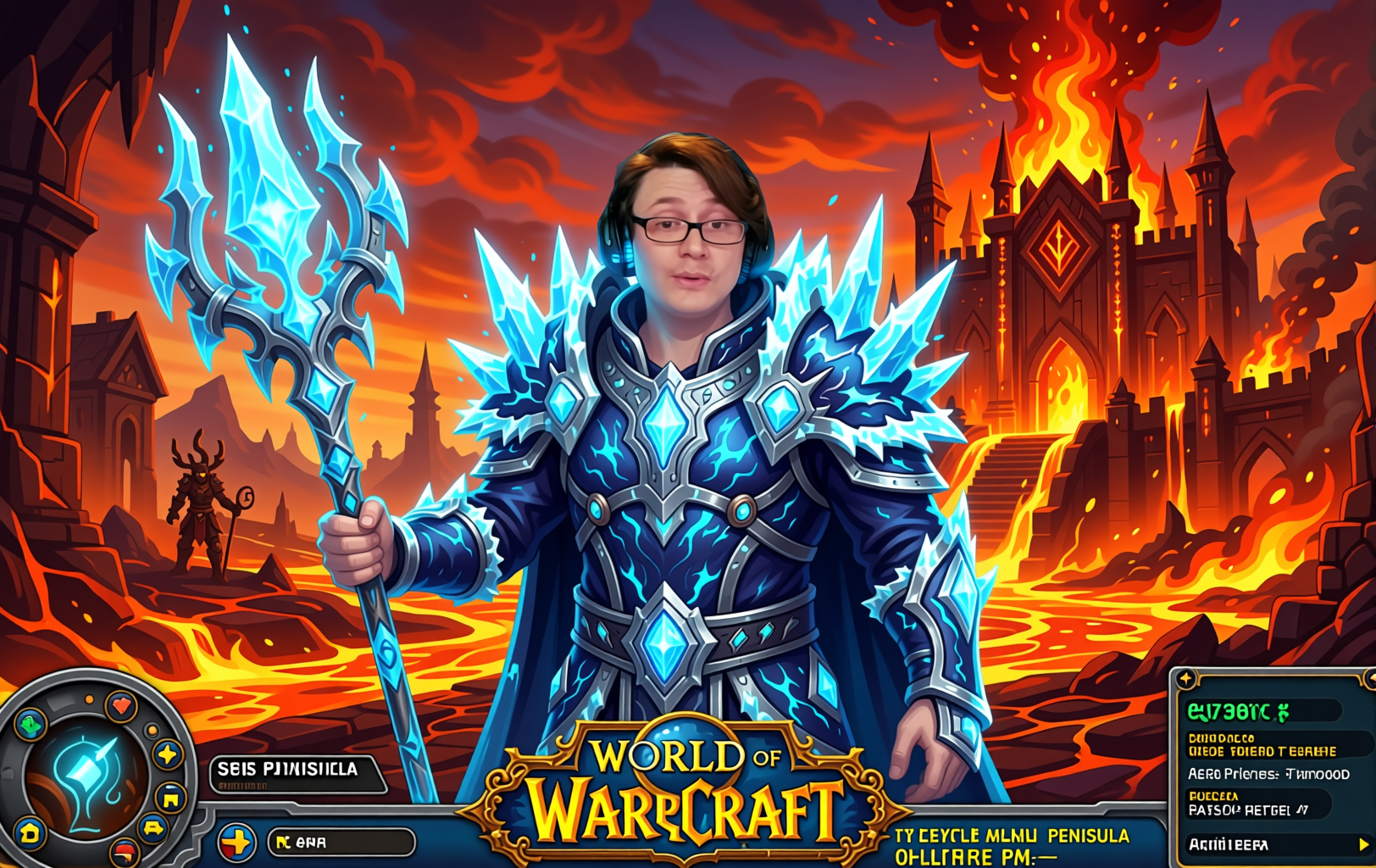 oh manthe man is dressed as a frost mage from World of Warcraft, and is in the game of World of Warcraft in Hellfire Peninsula.