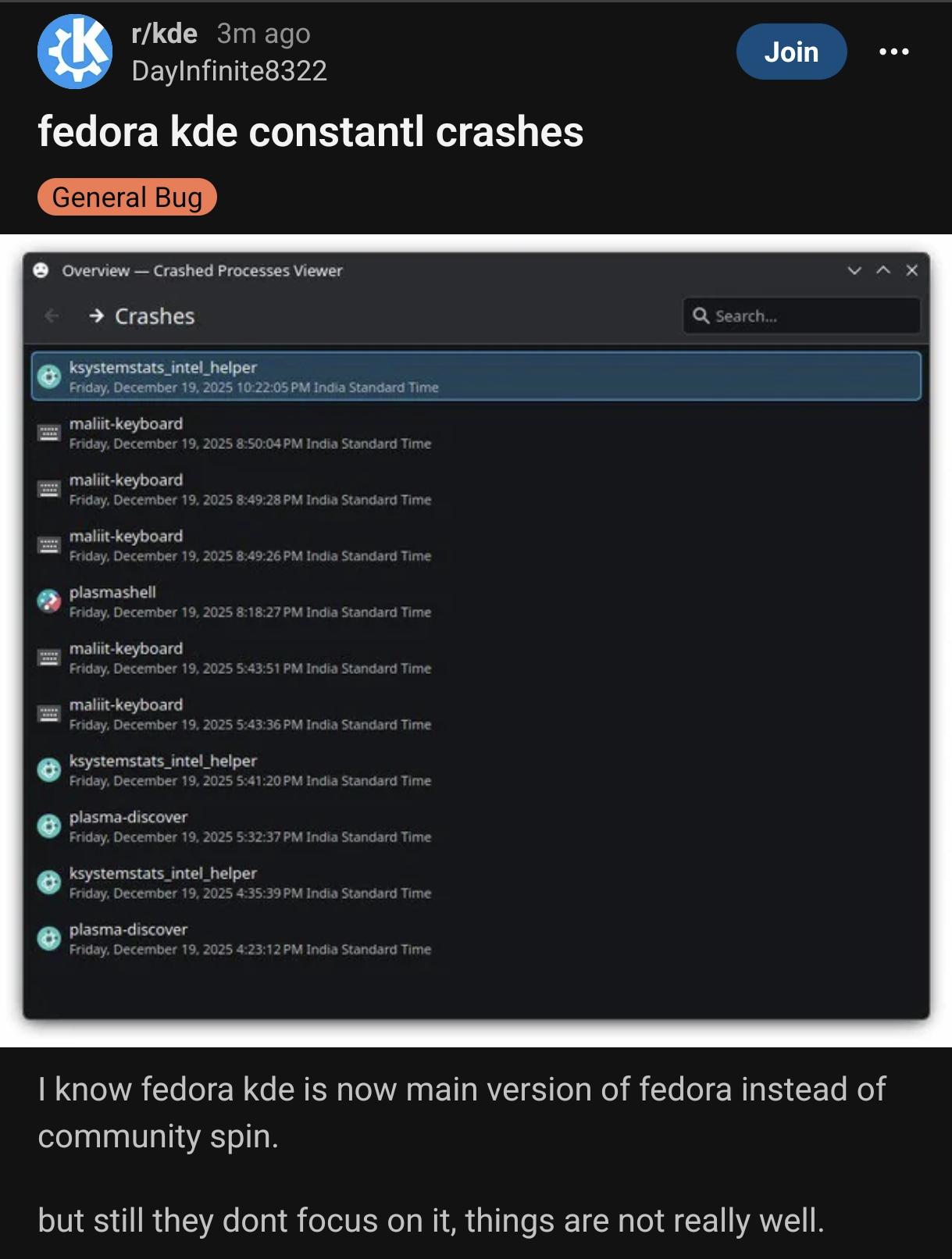Why does it krash?https://www.reddit.com/r/kde/comments/1prvpxq/fedora_kde_constantl_crashes/