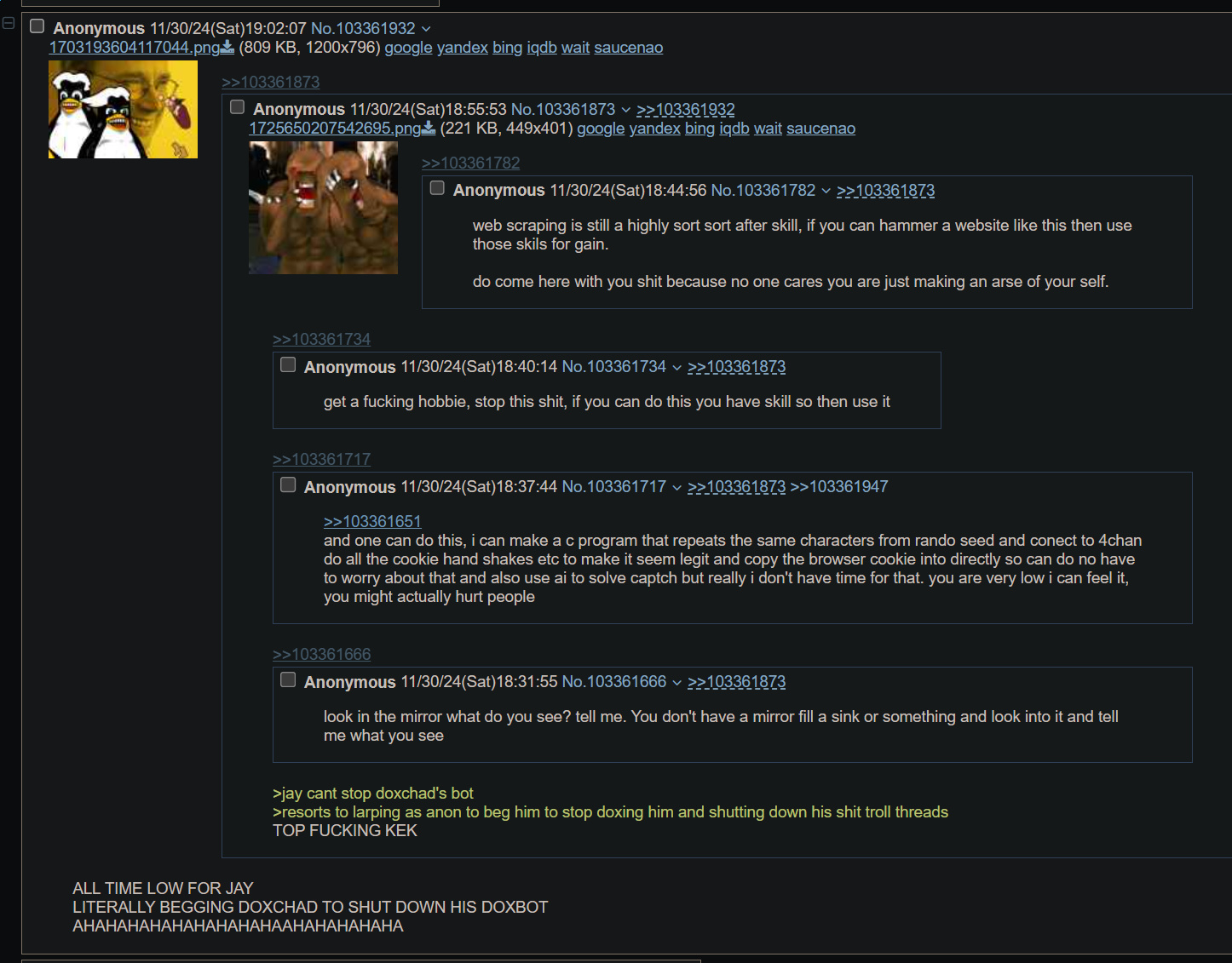 even if the image is hash-banned, you can easily just change the hash and filename. Its very convenient to do if you are using the gay. Also, it was spammed so hard that jay literally begged the dox spammer to stop, yet he still keeps making this flamewar troll threads like an absolute faggot he is.