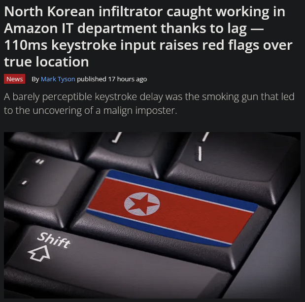 >Amazon would rather hire North Koreans than me It's over https://www.tomshardware.com/tech-industry/cyber-security/north-korean-infiltrator-caught-working-in-amazon-it-department-thanks-to-lag-110ms-keystroke-input-raises-red-flags-over-true-location
