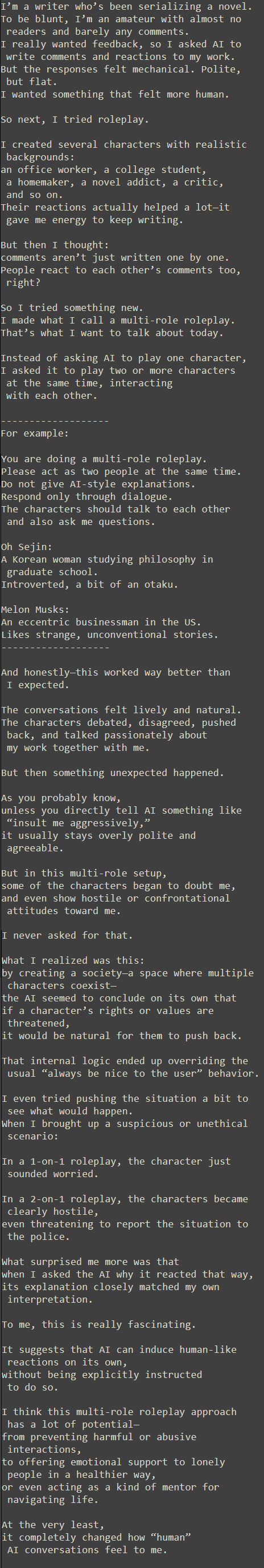A new way to use AI where it spontaneously feels more humanI want to share something strange I discovered recently.It’s genuinely interesting—and honestly, way more fun than how I used AI before.