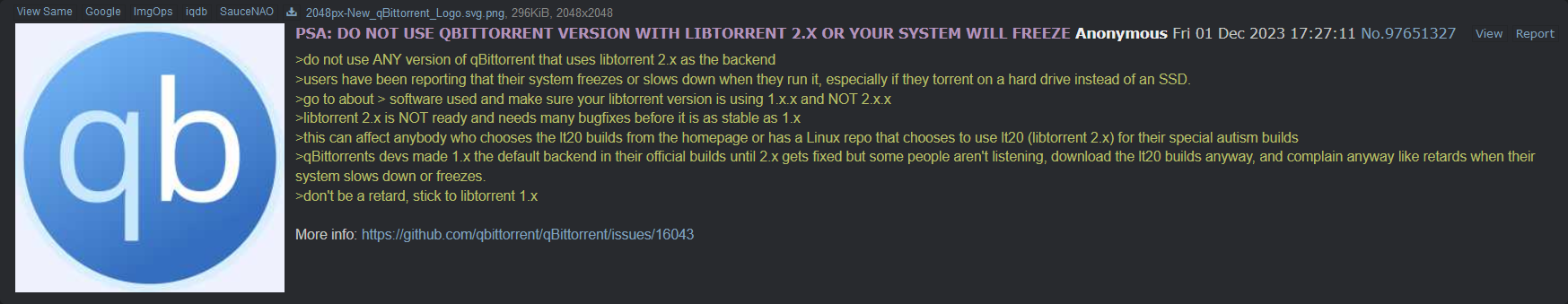 >>107117531>freezes because it has 10K+ folders/fileshttps://github.com/qbittorrent/qbittorrent/issues/16043