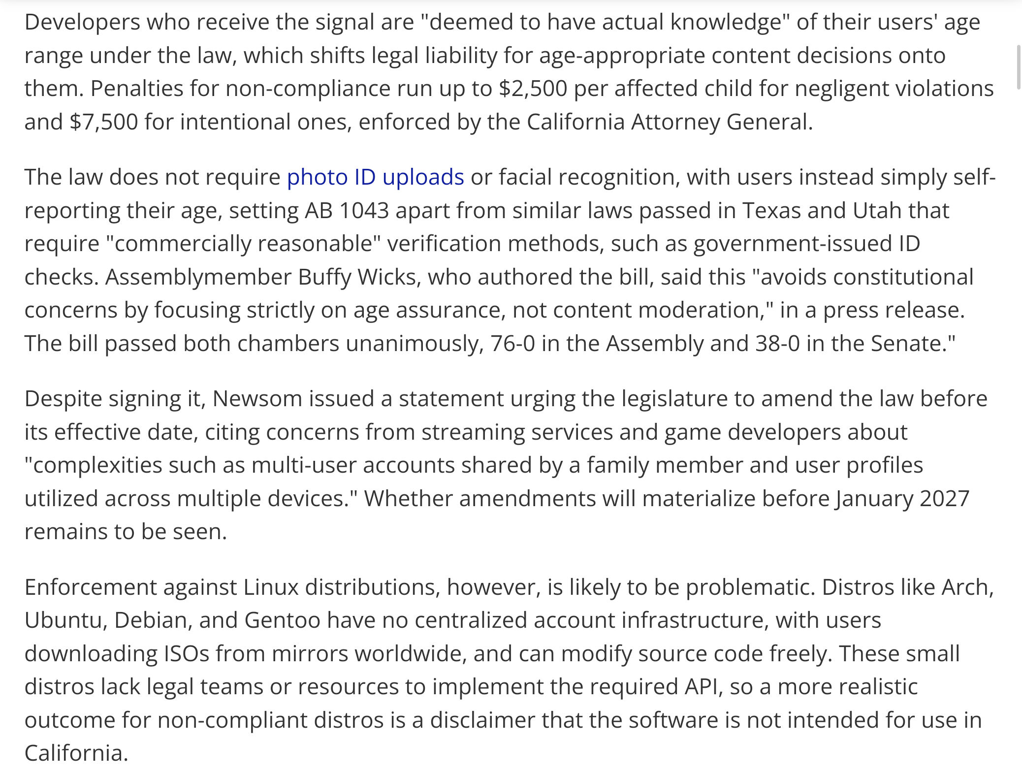 I know age verification is a hot topic on /g/ but I actually find Newsom's proposal completely and totally reasonable>The law does not require photo ID uploads or facial recognition, with users instead simply self-reporting their age, setting AB 1043 apart from similar laws passed in Texas and Utah that require "commercially reasonable" verification methods, such as government-issued ID checks. Assemblymember Buffy Wicks, who authored the bill, said this "avoids constitutional concerns by focusing strictly on age assurance, not content moderation," in a press release. The bill passed both chambers unanimously, 76-0 in the Assembly and 38-0 in the Senate."So when you set up the device, it asks you how old the user of the device is. If you're setting it up for your kid you can say they're 11. If you're setting it up for yourself you can say your age. Then websites like pornhub can just access this number instead of requiring the user to upload their ID or credit card or whatever else.Personally if it were my kid I'd just say they're 18 so they don't get the kiddy gloves bs but this seems like a reasonable compromise against the surveillance crap