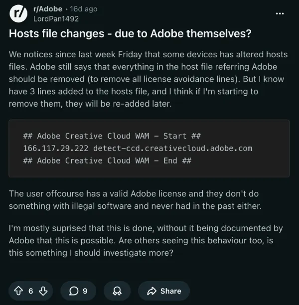 It seems Adobe is modifying hosts files without permission now. If you're using their programs or pirating, maybe give your hosts a look for new lines.