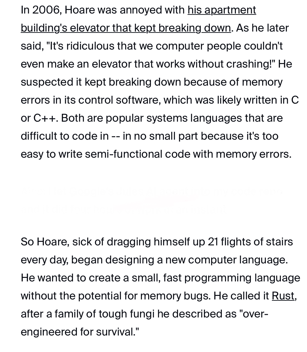 >>108511962> use caseThe use case is that some idiot thought his elevator wasn’t working because he “sensed” that it 1) had firmware (it doesn’t)2) somehow “knew” the firmware was written in C++ (it wasn’t)3) also “knows” that it was a memory access bug4) could NEVER be solved by rebooting the elevator controller—it never worked, it was shipped like that5) figured out the ONLY solution was to spend years developing a new languageBasically, a nutter/grifter.https://www.zdnet.com/article/rust-turns-10-how-a-broken-elevator-changed-software-forever/