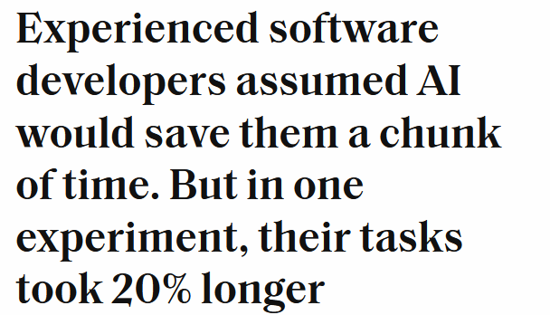 >>107817449The study literally boils down to AI tools not trained on your 1.1M+ LOC codebase aren't helping developers that have spent 5 years+ (10 really) on that codebase and it decreases productivity more due time taken for prompting and waiting on the AI generation than checking the output.That headline is fucking atrocious.