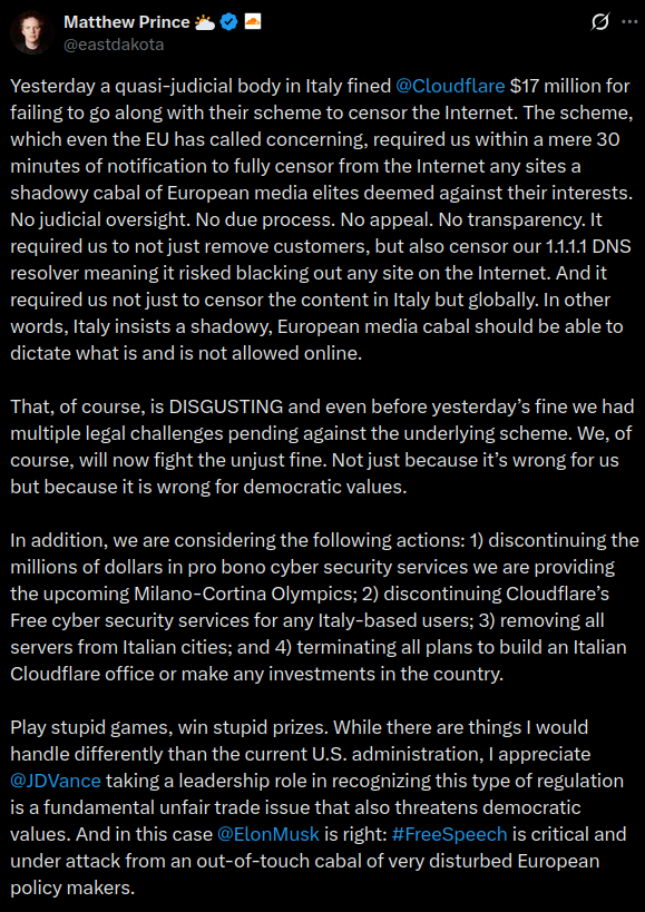 Oh cool, matthew prince pretending he cares about free speech. So when is he going to drop the ban on any site called 8ch@n or kiwif@rms using cloudflare?
