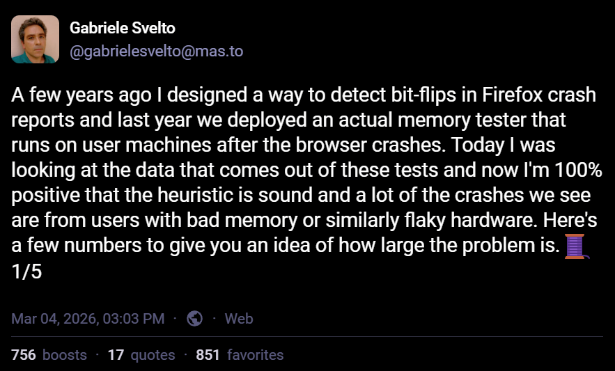 >>108338861if blaming Intel is correct, then Apple Silicon Macs should have lower rates of memory-related fuckups. I hear they don’t have _all_ of ECC’s fuckery protection, but they have some.Do Apple Silicon Macs have fewer general memory errors?