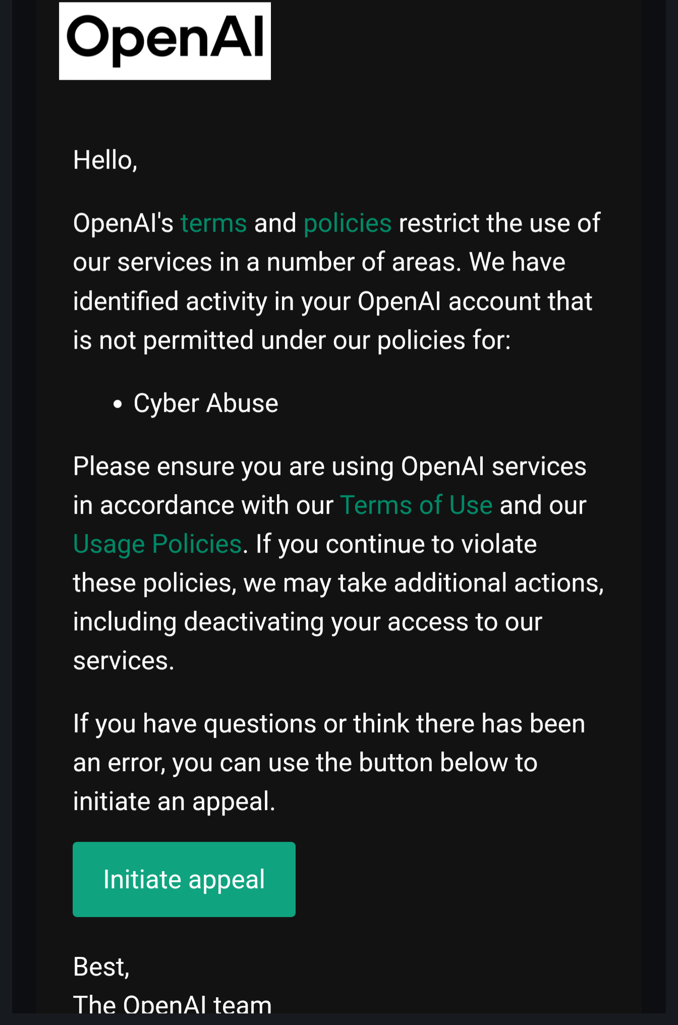 I just received this email from OpenAI this morning. What the hell is "Cyber Abuse"? I use Claude mostly now for projects and utilize chatgpt for business email rewrites. I don't do anything weird with AI that I can even think would prompt this.